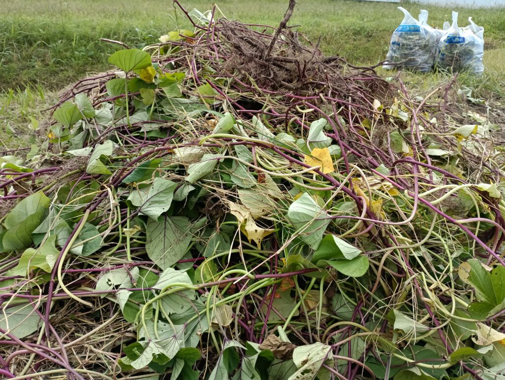 サツマイモを収穫すると、残るのはイモヅルの山!
