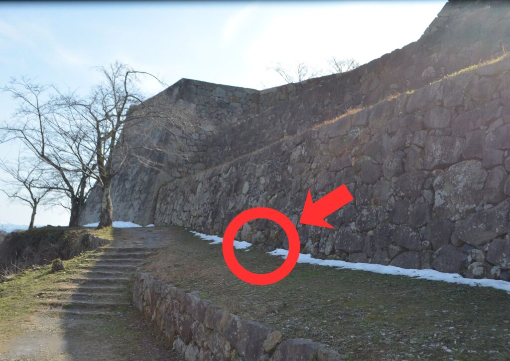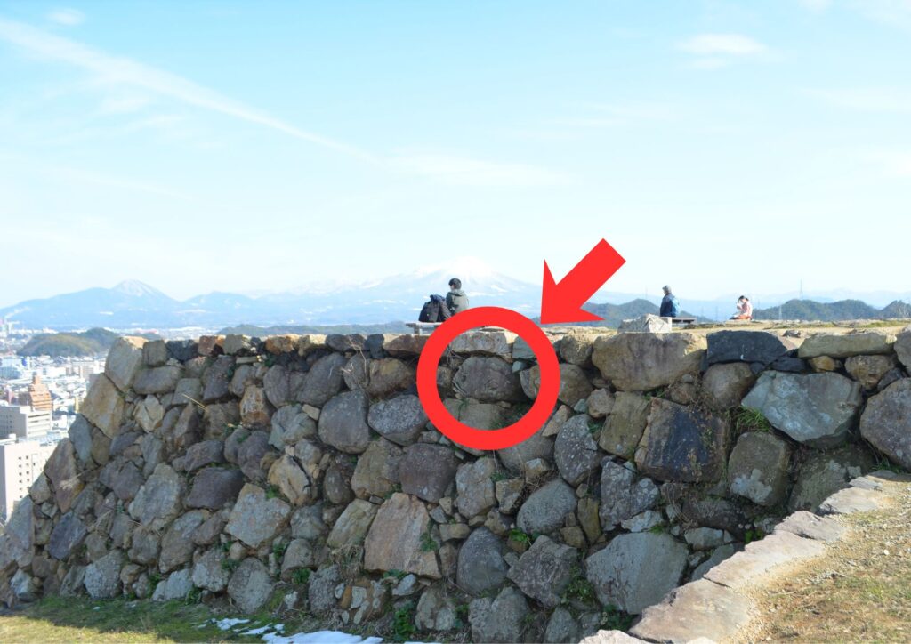 まずは、本丸の石垣の最下層に位置する「小僧石」。
